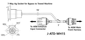 4-Wire tandem haul harness. Use with 4-wire Jammy ag lighting systems to bypass the enhance module, add a 7-way socket, and provide original signals to towed equipment to tandem hauling. This allows tandem haul equipment to utilize enhanced lighting via AEM Series enhancers on front and rear implements in tandem configuration. Connects between J-AGM Main (Front) harness and J-AEM Enhance Module. Features 4-way weather pack connectors, sealed jacketed cable, and heavy duty (round pin) 7-way socket. Includes mounting bracket and hardware.